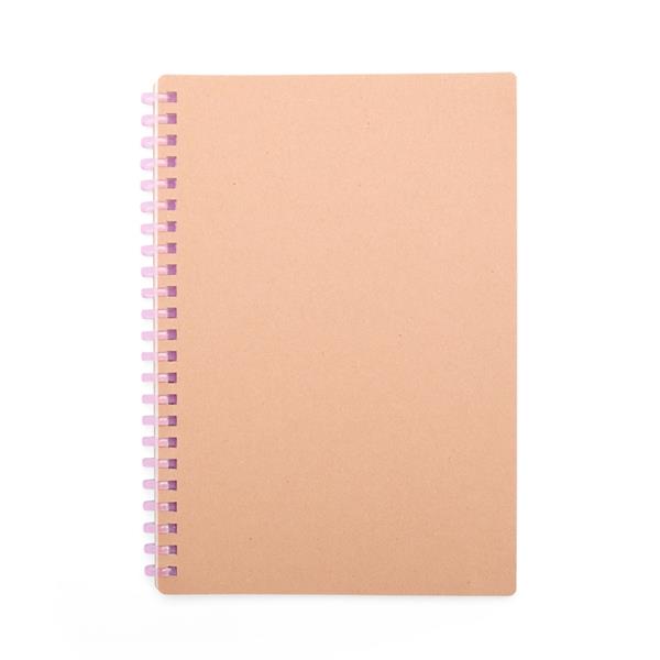 Caderneta com capa em kraft e encadernação em espiral de plástico. Possui cerca de 80 folhas brancas pautadas.