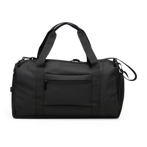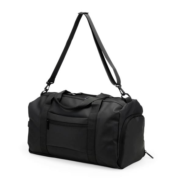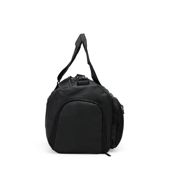 Bolsa confeccionada em couro sintético com capacidade de até 32 litros. Apresenta compartimento interno com bolso de zíper e outros dois bolsos abertos. Conta ainda com cinco compartimentos externos em diferentes tamanhos, incluindo um lateral dedicado para tênis, um bolso menor com encaixe para malas e outro para itens molhados. Possui duas alças de mão e alça transversal removível.
