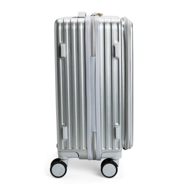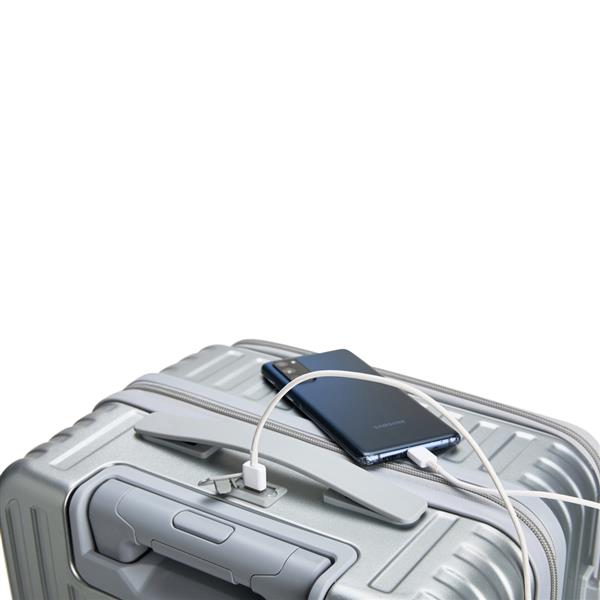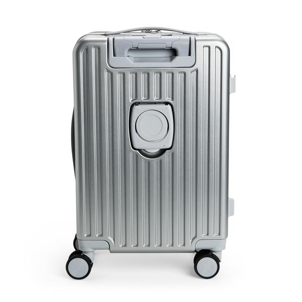 Mala de viagem feita em policarbonato (PC) com capacidade de até 32 litros. Apresenta compartimentos internos de diferentes tamanhos, incluindo um bolso telado e outro em plástico para itens molhados. Possui alça superior, alça lateral, puxador retrátil ajustável em dois níveis, quatro rodinhas com rotação de 360 graus, suporte para copo ou garrafa, quatro apoios laterais e cadeado numérico TSA. Dispõe ainda de compartimento frontal com três bolsos em tamanhos variados.