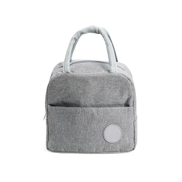 Bolsa térmica feita em poliéster resistente à água e capacidade de até 5 litros. Possui revestimento interno em folha de alumínio, além de bolso frontal com plaquinha fixa em plástico e par de alças de nylon para transporte.