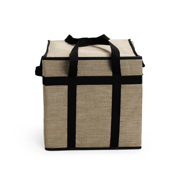 Bolsa térmica confeccionada em Oxford impermeável, fechamento em velcro e capacidade máxima de 31 litros. Conta com armação interna em placa de PVC e junção inferior em velcro, que facilita o transporte quando a bolsa não estiver em uso. Possui revestimento térmico interno em folha de alumínio e um par de alças de nylon para transporte.