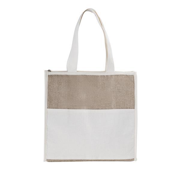Bolsa térmica em Juta sintética e bolso em algodão. Interior costurado revestido em alumínio, alça de mão e capacidade de até 18 Litros. Sistema de fechamento por meio de zíper.
