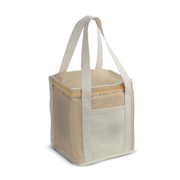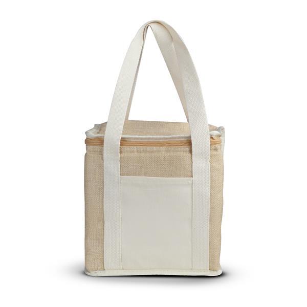 Bolsa térmica em Juta sintética e bolso em algodão. Interior costurado revestido em PEVA branco, com alça de mão e capacidade de até 5L. Sistema de fechamento por meio de zíper.