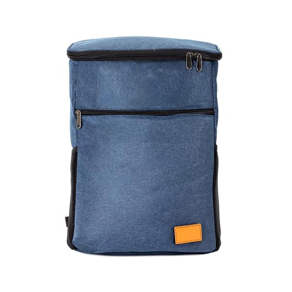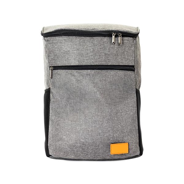 Mochila térmica confeccionada em poliéster catiônico 300D resistente à água e capacidade máxima para até 18 litros. Possui revestimento térmico antivazamento em PEVA atóxico no compartimento principal, além de um bolso frontal com fechamento em zíper, dois bolsos laterais em espuma com elástico, duas alças para as costas e uma alça de mão em nylon. Acompanha plaquinha em couro sintético fixada com velcro.