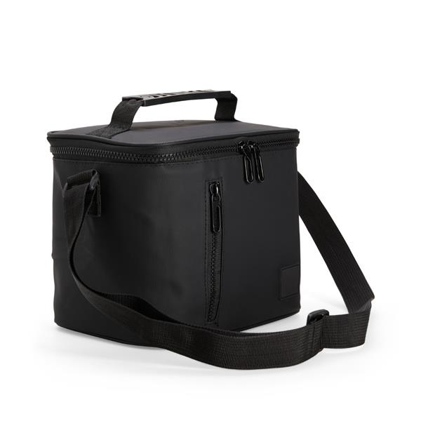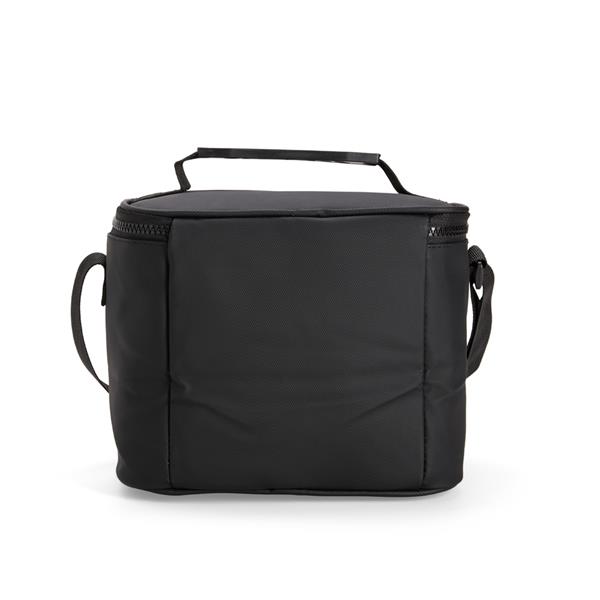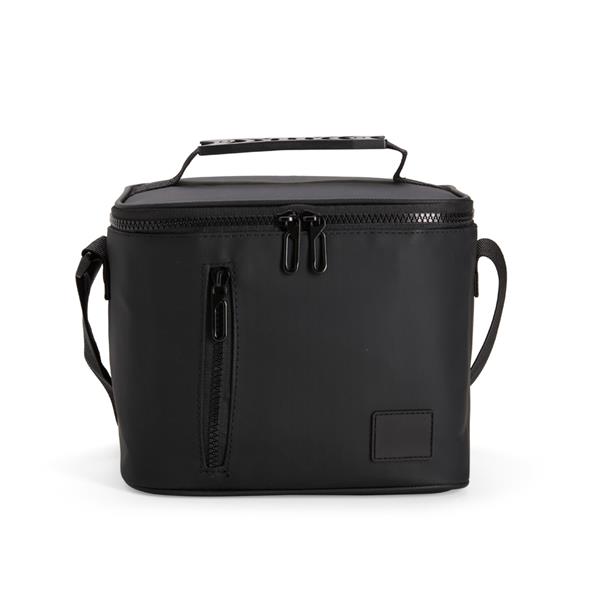 Bolsa térmica confeccionada em poliéster mesclado com PVC impermeável, fechamento por zíper e capacidade máxima de 6 litros. Possui revestimento térmico em PEVA atóxico, o que ajuda a conservar a temperatura de alimentos e bebidas por mais tempo. Conta também com bolso frontal, placa emborrachada para personalização, uma alça de mão e alça transversal.