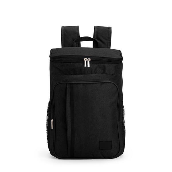 Mochila térmica em poliéster catiônico 300D impermeável com fechamento em zíper e capacidade máxima de 17 litros. Possui compartimento térmico em PEVA antivazamento, dois compartimentos frontais em tamanho diferentes, um par de bolsos em malha de elástico, além de alças de ombros com revestimento em espuma respirável, alça de mão em nylon e plaquinha fixa em PVC.