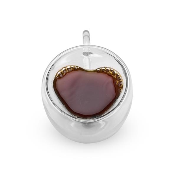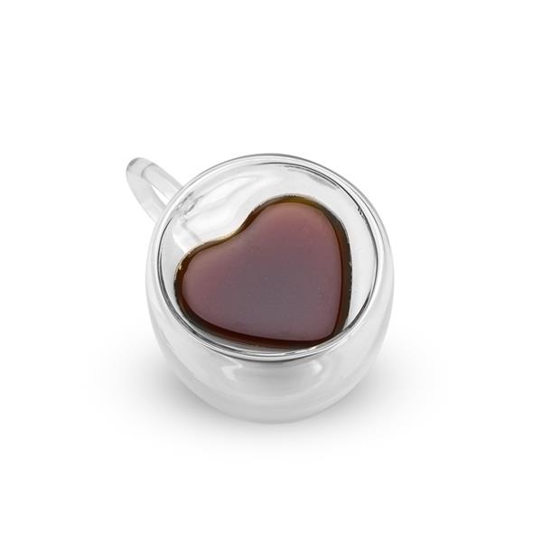 Xícara de vidro com capacidade para até 80 ml. Possui contorno interno em formato de coração e estrutura de parede dupla que ajuda a impedir que a temperatura de líquidos entre em contato com a parte externa.