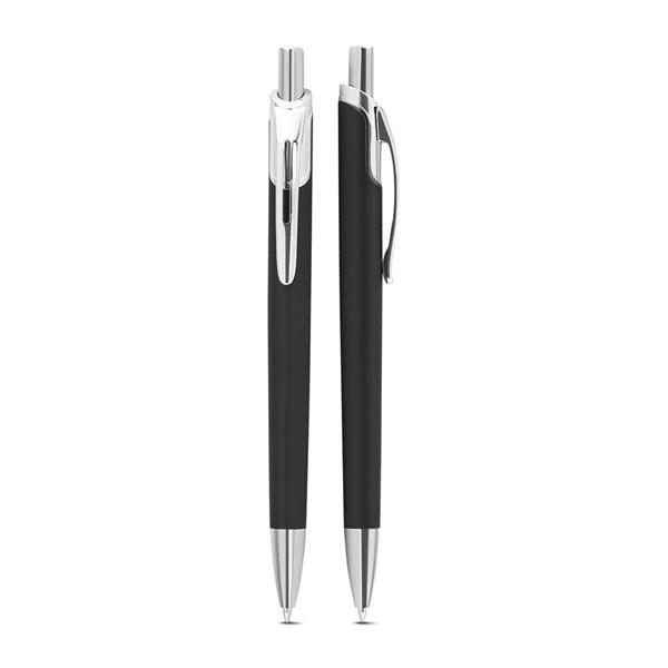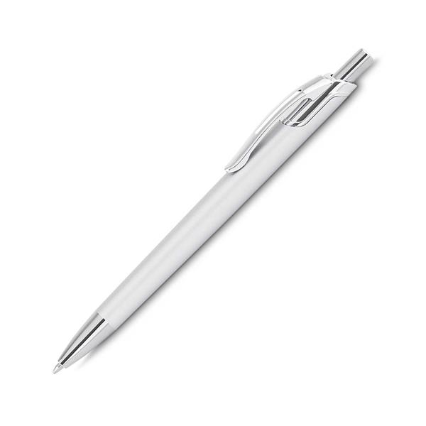 Caneta com corpo em alumínio reciclado, acionador e clipe cromado, escrita esferográfica em azul.