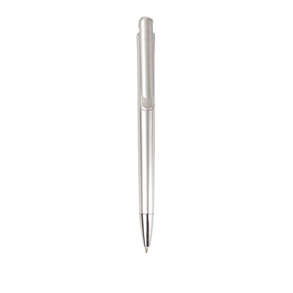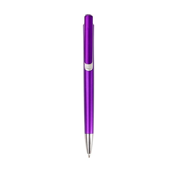 Caneta plástica com ponta metálica, acionamento por clique e abertura que funciona como suporte de celular. Possui ponteira com revestimento em feltro para limpeza de telas e carga esferográfica azul de 1.0mm.