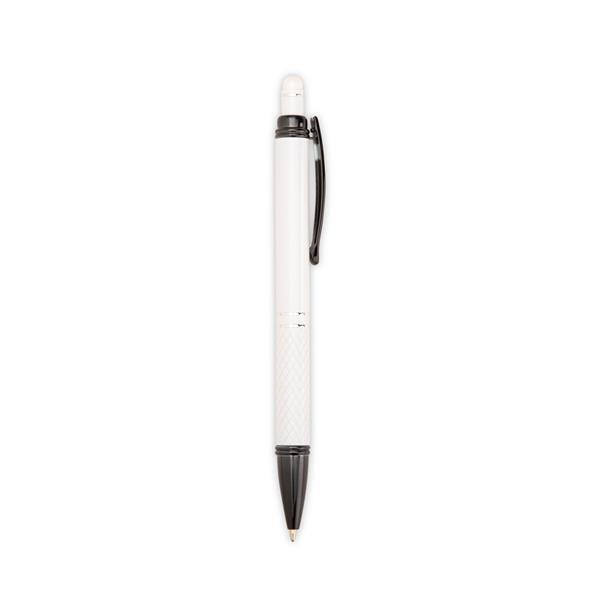 Caneta metálica com textura próximo à ponta, detalhes em plástico e acabamento emborrachado no topo para o uso em dispositivos com telas sensíveis ao toque. Conta ainda com acionamento por clique e carga esferográfica azul de 1,0mm. Altura : 13,9 cm Largura : 1,6 cm Peso aproximado (g): 19