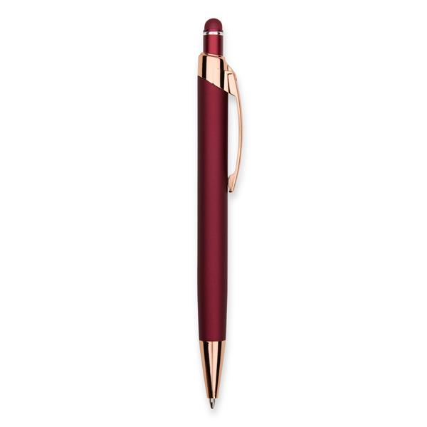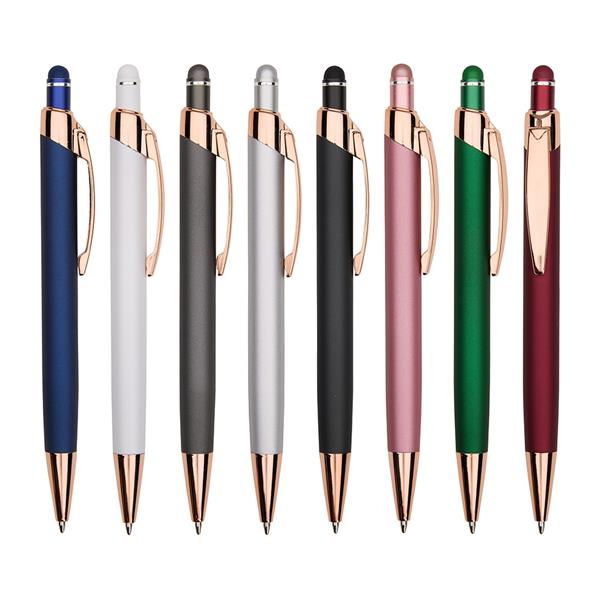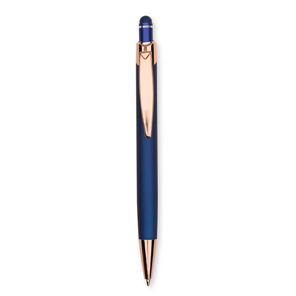 Caneta metálica com carga esferográfica azul de 1,0mm e acionamento por clique de revestimento emborrachado para interação em dispositivos com telas sensíveis ao toque. Largura : 1,7 cm Comprimento : 14,1 cm Peso aproximado (g): 17
