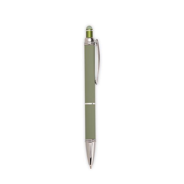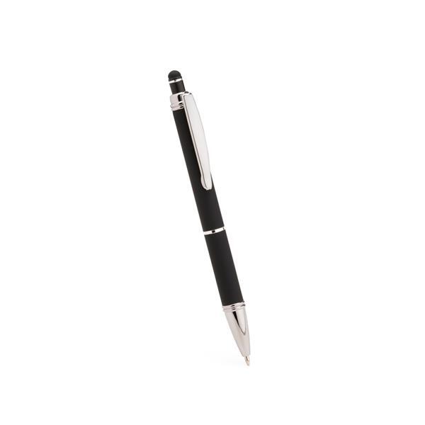 Caneta metálica com pintura de acabamento emborrachado. Possui acionamento por clique, topo emborrachado para uso em dispositivos com telas sensíveis ao toque e carga esferográfica azul de 1,0 mm.