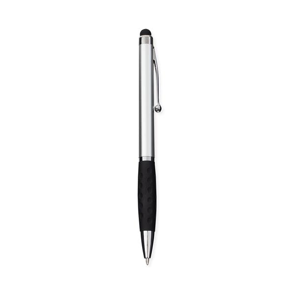 Caneta plástica com ponta, clip e pequenos detalhes em metal, além de detalhes ergonômicos na área próxima à tampa. Possui acionamento por rotação, carga esferográfica azul de 1.0mm e ponteira emborrachada para interação com dispositivos de telas sensíveis ao toque.