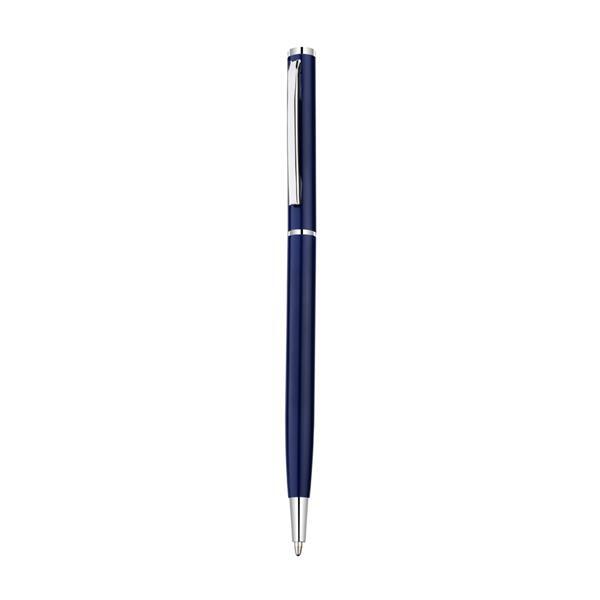 Caneta esferográfica em metal com escrita em azul. Dimensão Produto: 14,0xø0,85cm (AxøD) Peso do Produto: 0,010kg
