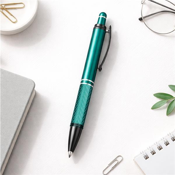 Caneta metálica com textura próximo à ponta, detalhes em plástico e acabamento emborrachado no topo para o uso em dispositivos com telas sensíveis ao toque. Conta ainda com acionamento por clique e carga esferográfica azul de 1,0mm. Altura : 13,9 cm Largura : 1,6 cm Peso aproximado (g): 19