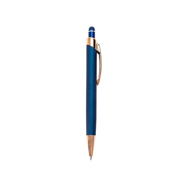 Caneta metálica com carga esferográfica azul de 1,0mm e acionamento por clique de revestimento emborrachado para interação em dispositivos com telas sensíveis ao toque. Largura : 1,7 cm Comprimento : 14,1 cm Peso aproximado (g): 17