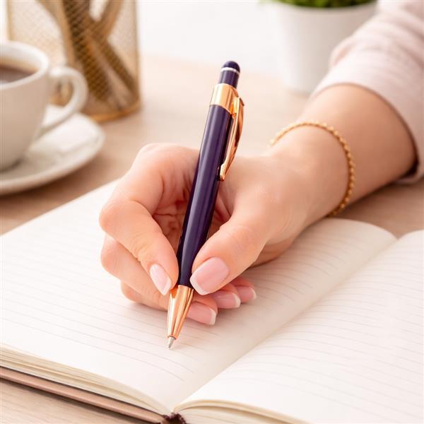 Caneta metálica com ponteira e clip com acabamento em tom acobreado. Apresenta acionamento por clique com topo emborrachado para uso em telas sensíveis ao toque e carga esferográfica azul.