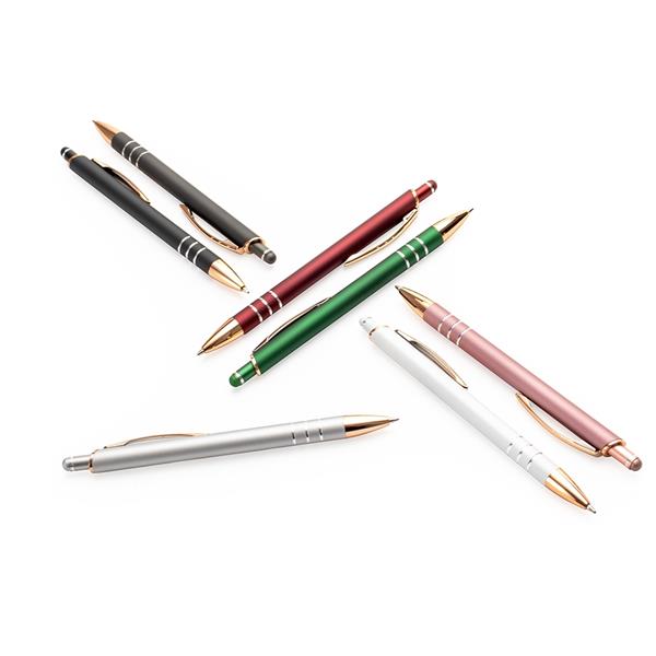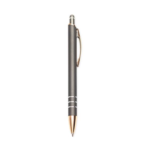Caneta metálica com carga esferográfica de 1,0mm e acionamento por clique de revestimento emborrachado, ideal para interagir com telas sensíveis ao toque. Largura : 1,6 cm Comprimento : 14,3 cm Peso aproximado (g): 17