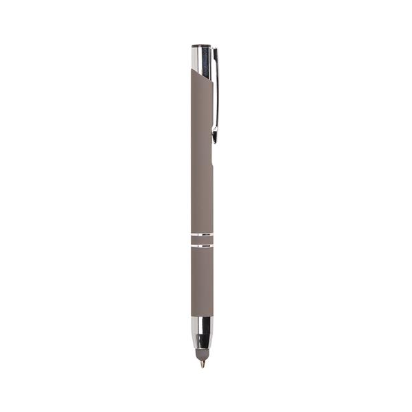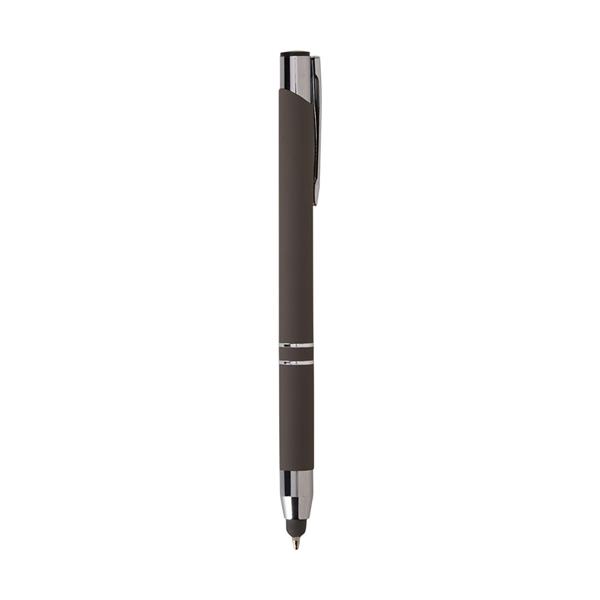 Caneta esferográfica com carga azul de 1.0mm e acionamento por clique. De construção metálica, também possui ponteira emborrachada que permite seu uso como uma caneta touch para interação com dispositivos de tela sensível ao toque.