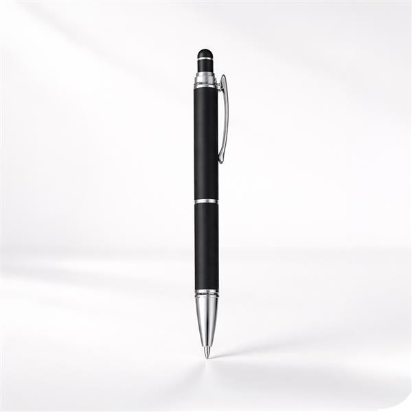 Caneta metálica com pintura de acabamento emborrachado. Possui acionamento por clique, topo emborrachado para uso em dispositivos com telas sensíveis ao toque e carga esferográfica azul de 1,0 mm. Altura : 14 cm Largura : 1,6 cm Medidas aproximadas para gravação (CxL): 0,8 cm x 5,5 cm Peso aproximado (g): 18