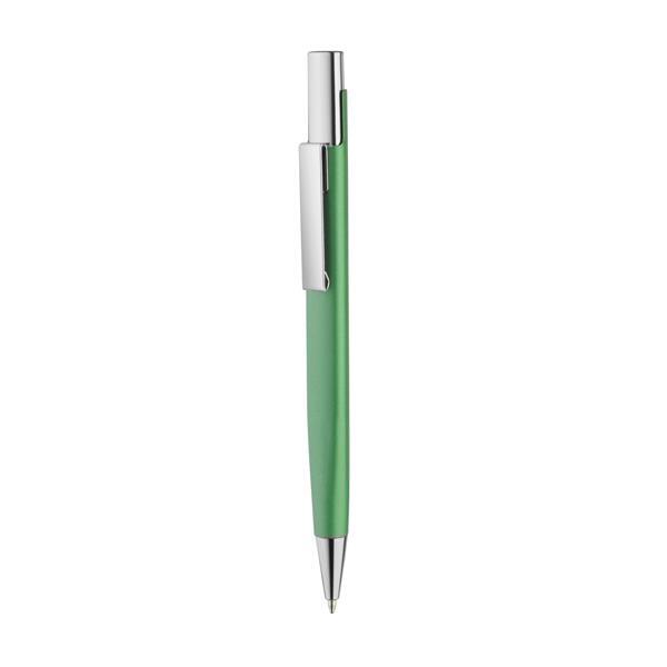 Caneta esferográfica de metal escrita em azul. Dimensão Produto: 14,6xø1,4cm (AxøD) Peso do Produto: 0,022kg