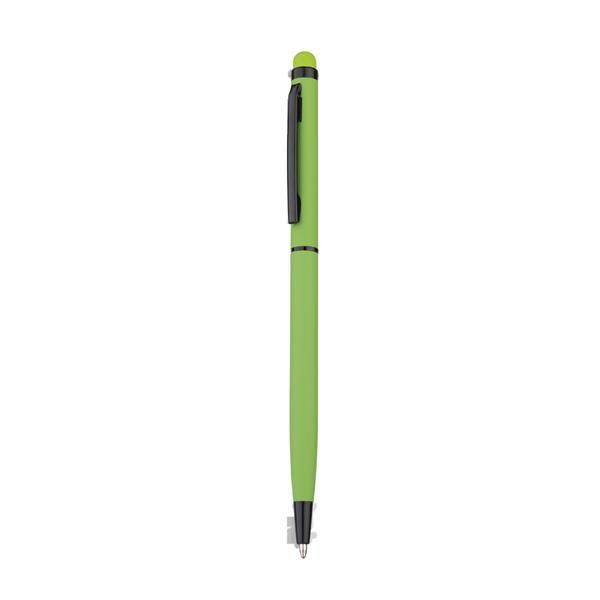 Caneta esferográfica de metal com escrita em azul, com ponta touch com corpo emborrachado. Detalhe preto. Medidas do produto: 13,5xø0,6cm (AxøD) Peso do produto: 0,010kg