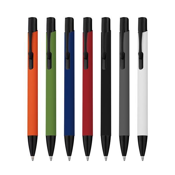 Caneta esferográfica de metal escrita em azul, com corpo emborrachado. Medidas do produto: 14,5xø0,6cm (AxøD) Peso do produto: 0,014kg