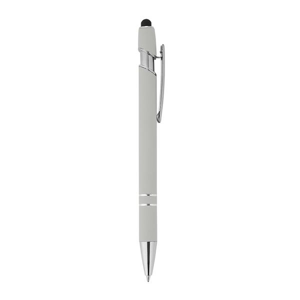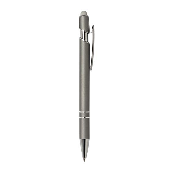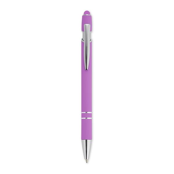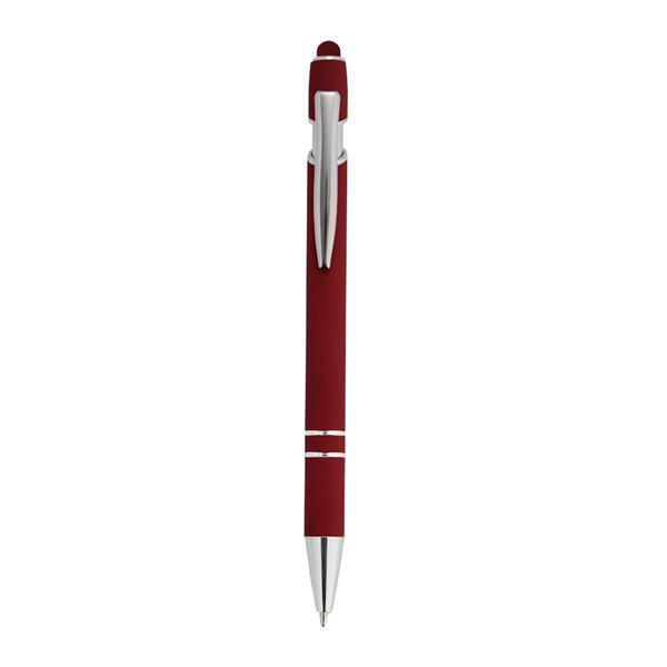 Caneta metálica touchscreen com acabamento similar à borracha, acionamento por clique e carga esferográfica azul 1.0mm. Largura : 1,5 cm Comprimento : 14,1 cm Peso aproximado (g): 17