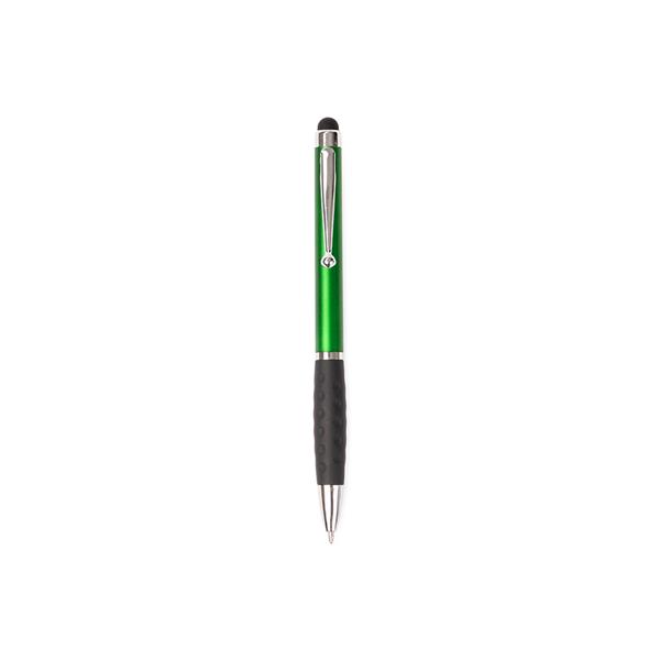Caneta plástica com ponta, clip e pequenos detalhes em metal, além de detalhes ergonômicos na área próxima à tampa. Possui acionamento por rotação, carga esferográfica azul de 1.0mm e ponteira emborrachada para interação com dispositivos de telas sensíveis ao toque.