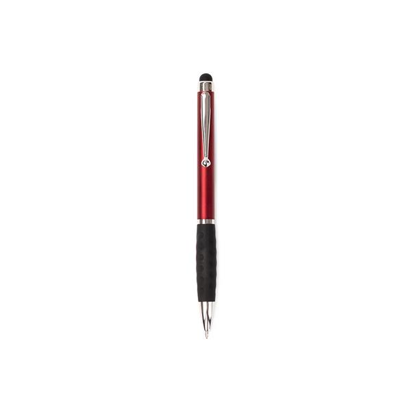 Caneta plástica com ponta, clip e pequenos detalhes em metal, além de detalhes ergonômicos na área próxima à tampa. Possui acionamento por rotação, carga esferográfica azul de 1.0mm e ponteira emborrachada para interação com dispositivos de telas sensíveis ao toque. Largura : 1,3cm Comprimento : 13,1 cm Peso aproximado (g): 6