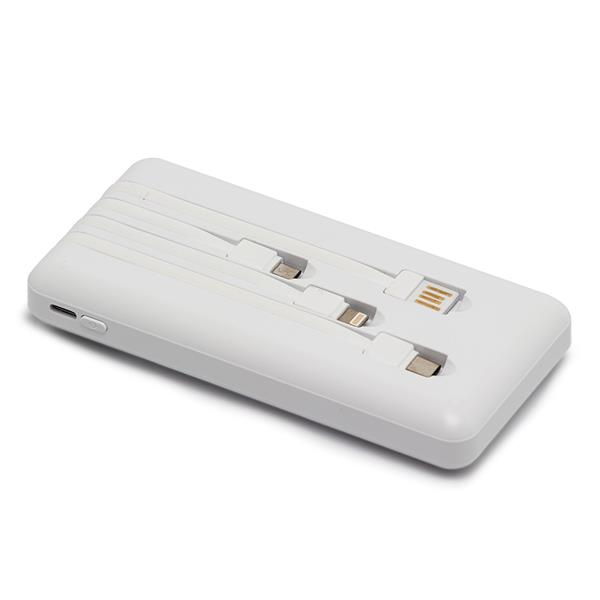 Carregador power bank de 10.000mAh com lanternas e múltiplas saídas. Fabricado em plástico com display integrado, este power bank vem equipado com quatro cabos de carregamento, eliminando a necessidade de transportar cabos extras. Compatível com entradas V8, Tipo-C, Lightning e USB, ele oferece praticidade absoluta. Para um transporte conveniente e seguro, o power bank possui ventosas para fixação do celular e uma capacidade real de 6.000mAh para manter os dispositivos sempre carregados.. Acompanha cabo USB-V8.