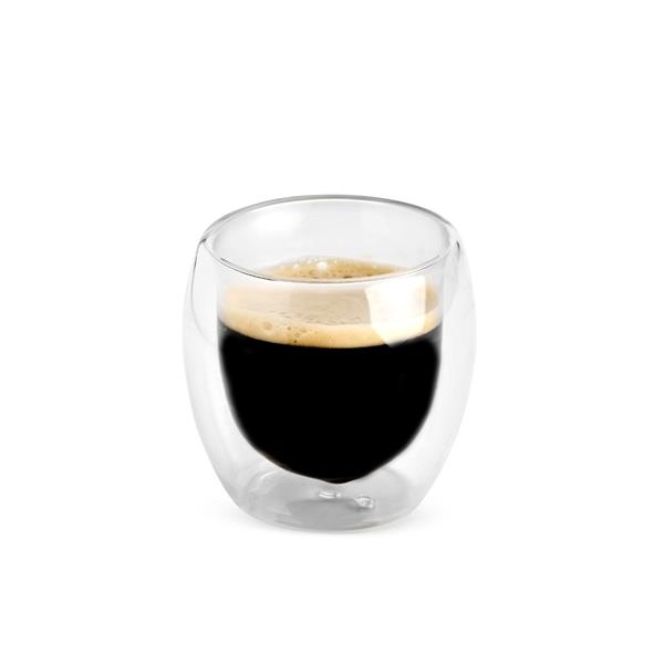 Copo de vidro borossilicado com capacidade máxima de 250 ml e estrutura de parede dupla, que ajuda a impedir o contato direto entre a temperatura do líquido e a parede externa da caneca.