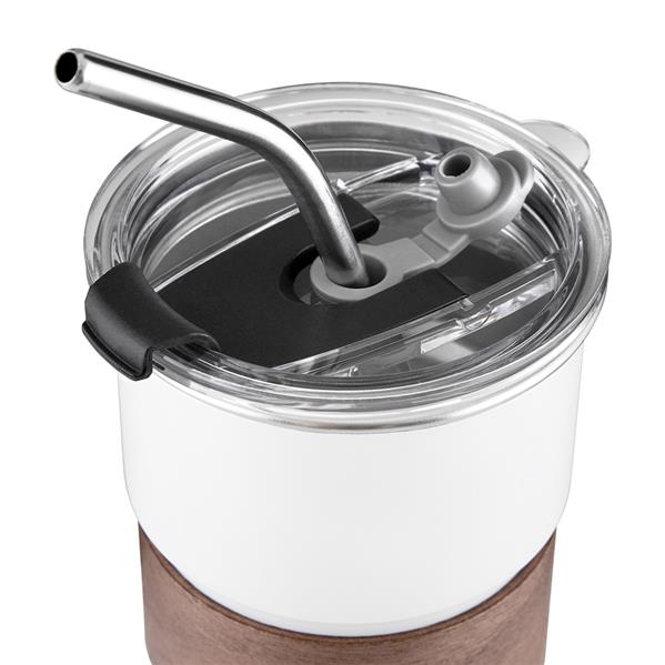 Copo de parede simples em aço inox 304 com capacidade de 250 ml, com canudo em inox. Tampa em plástico poliestireno (PS) que também possui um bico como forma alternativa de uso. Com pegador em fibra natural de noz. Possui acabamento externo com pintura fosca.