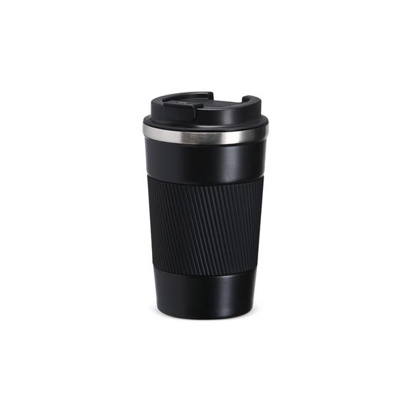 Copo térmico em inox 304 com pintura eletrostática, base antiderrapante e capacidade máxima de 350 ml. Possui estrutura de parede dupla e vedação a vácuo, permitindo a conservação da temperatura de líquidos por mais tempo. Conta ainda com tampa rosqueável em plástico com trava protetora no bocal e luva removível em silicone.
