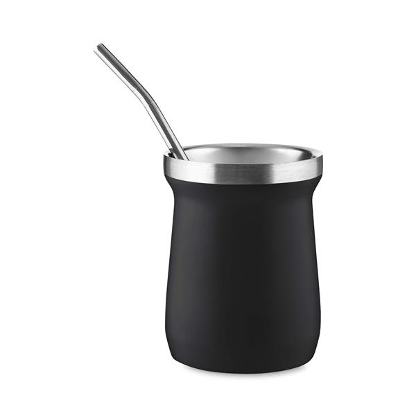 Cuia térmica em inox com capacidade para até 250 ml. Possui estrutura de parede dupla, que permite conservar a temperatura de líquidos por mais tempo sem transferir a sensação de frio ou calor para a parede externa. Acompanha canudo bomba em inox.