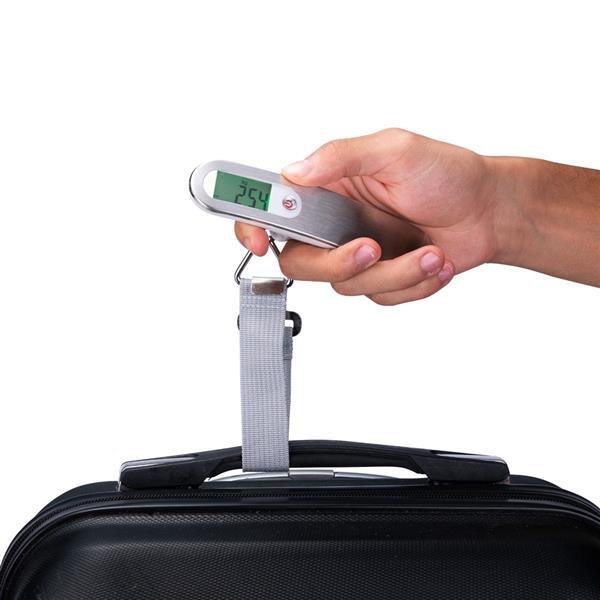 Balança digital para medição de malas e bagagens em geral. Possui capacidade máxima de 50 kg e estrutura em plástico e metal, além de visor em LCD para exibição do peso e cinto de nylon com gancho para fixação da bagagem. Funciona por uma bateria CR2032 inclusa.