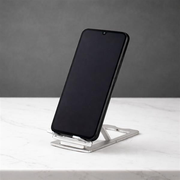 Suporte para celular em alumínio com 7 níveis de ajuste e revestimento antiderrapante em silicone na base e na área de apoio do smartphone.