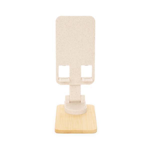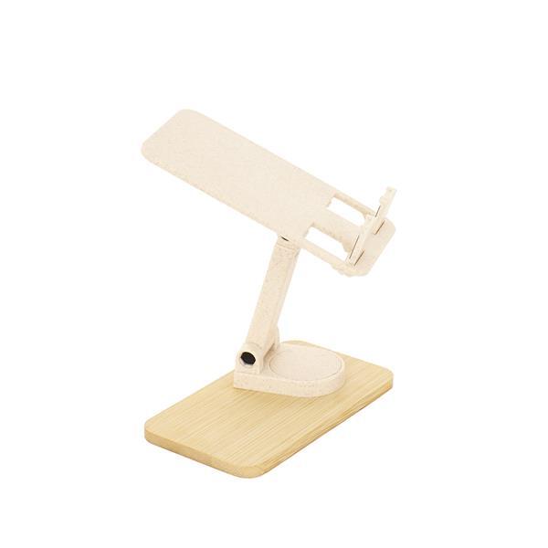 Suporte para celular retrátil feito em plástico a partir da fibra de trigo e base em bambu. Possui articulação multiangular e rotação em 360 graus, além de tiras antiderrapantes localizadas no suporte e na base. Observação: pode apresentar instabilidade a depender do ângulo de uso, é recomendável realizar um teste prévio antes do uso efetivo.