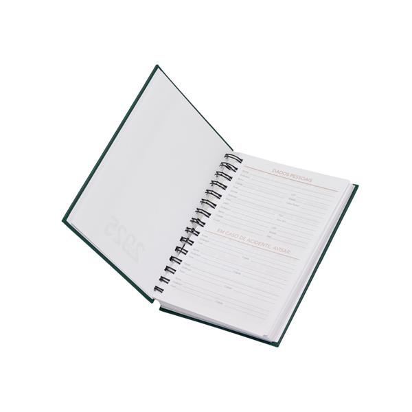 Agenda modelo 2026 com capa dura em cromato e encadernação em Wire-O. Contém páginas dedicadas a dados pessoais, calendários de 2025 até 2027, orçamentos mensais, anotações, planejamentos mensais, lista de contatos e mapas.