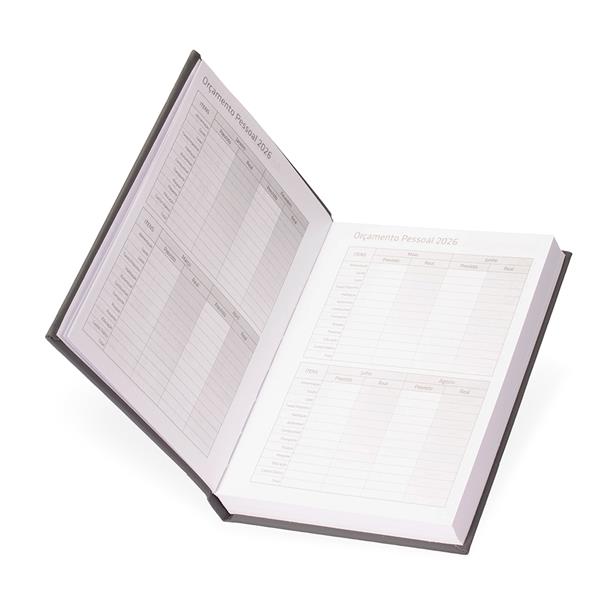 Agenda 2026 com capa emborrachada. Conta com páginas dedicadas para dados pessoais, calendários de 2025 a 2027, orçamento pessoal, planejamento mensal, espaço para anotações diárias e lista de contatos e aniversários.
