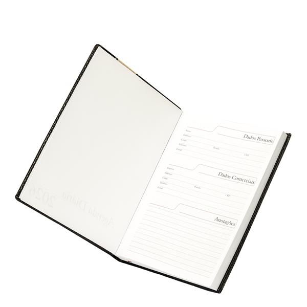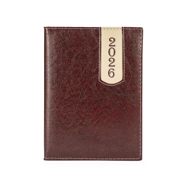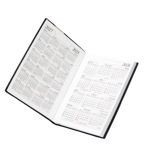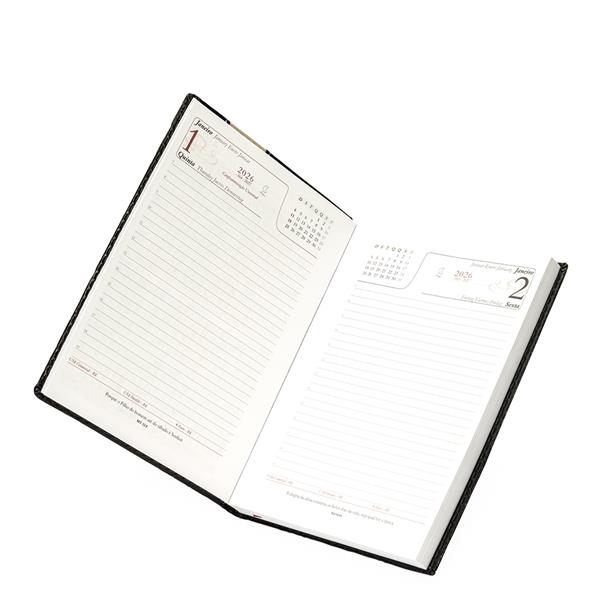 Agenda diária com capa em couro sintético, detalhes de costura e o ano "2026" presente no canto superior direito. Contém marca-páginas em fita de cetim, páginas dedicadas a dados pessoais, calendários de 2025 a 2027, contatos, planejamento diário e mapas. OBS.: PEDIDOS APENAS MÚLTIPLOS DE 10 PEÇAS! Altura : 20 cm Largura : 14,7 cm Espessura : 2 cm Peso aproximado (g): 375