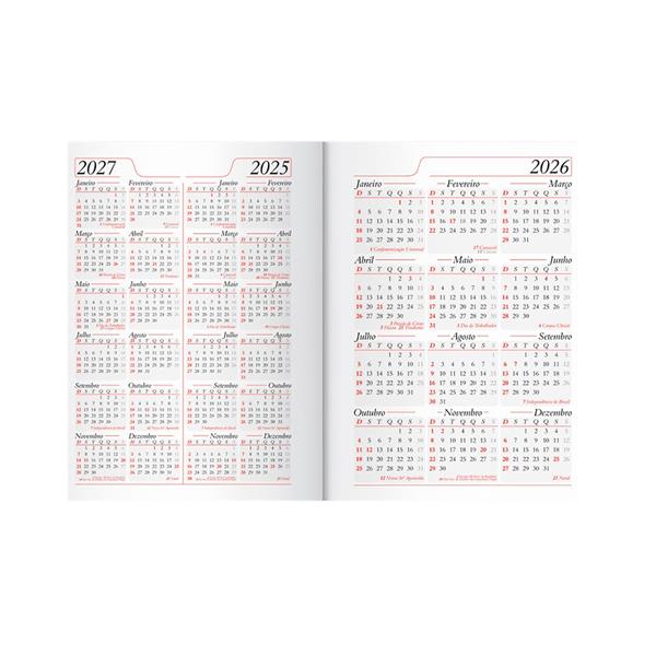 Agenda diária 2026 de couro sintético. Contém fita de cetim marca página, dados pessoais, calendário de 2025 à 2027, mapa do Brasil, mapa-múndi, índice telefônico e planejamento.