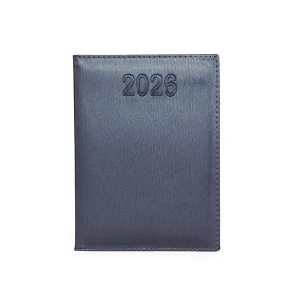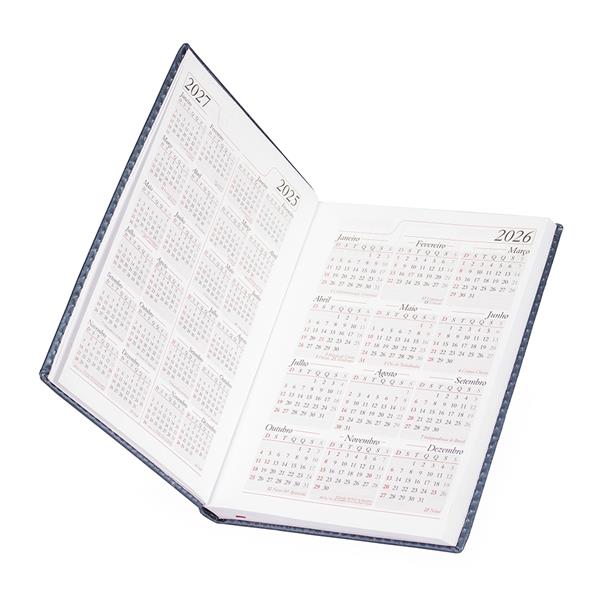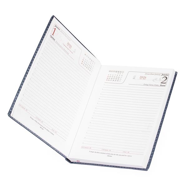 Agenda diária 2026 com capa em couro sintético metalizado e marca-páginas em fita de cetim. Possui páginas dedicadas a dados pessoais, calendários de 2025 a 2027, lista de contatos, planejamento diário e mapas. OBS.: PEDIDOS APENAS MÚLTIPLOS DE 10 PEÇAS! Altura : 20 cm Largura : 14,7 cm Espessura : 2 cm Peso aproximado (g): 371