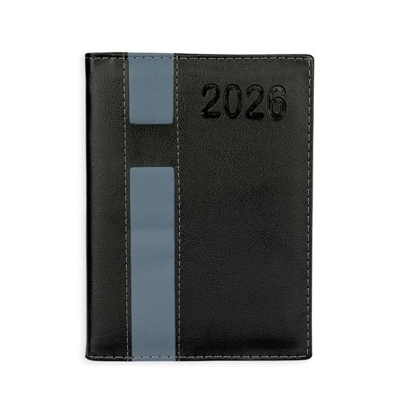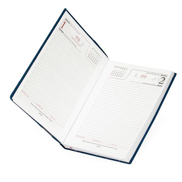 Agenda diária 2026 com capa em couro sintético, suporte para caneta e marca páginas em fita de cetim. Possui páginas dedicadas a dados pessoais, calendários de 2025 a 2027, lista de contatos, planejamento diário e mapas. OBS.: PEDIDOS APENAS MÚLTIPLOS DE 10 PEÇAS! Altura : 20 cm Largura : 14,7 cm Espessura : 2 cm Peso aproximado (g): 381