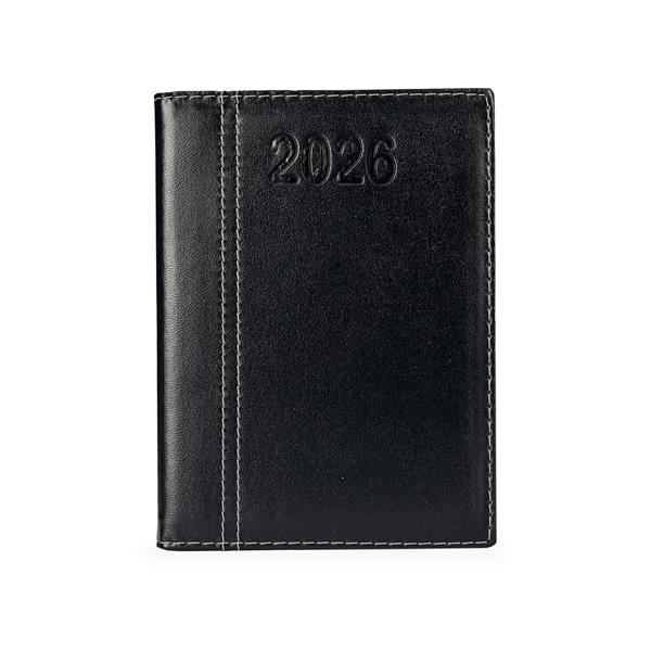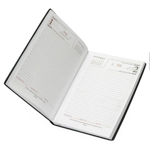 Agenda diária 2026 com capa em couro sintético e marca páginas em fita de cetim. Possui páginas dedicadas a dados pessoais, calendários de 2025 a 2027, lista de contatos, planejamento diário e mapas. OBS.: PEDIDOS APENAS MÚLTIPLOS DE 10 PEÇAS! Altura : 20 cm Largura : 14,6 cm Espessura : 2 cm Peso aproximado (g): 370