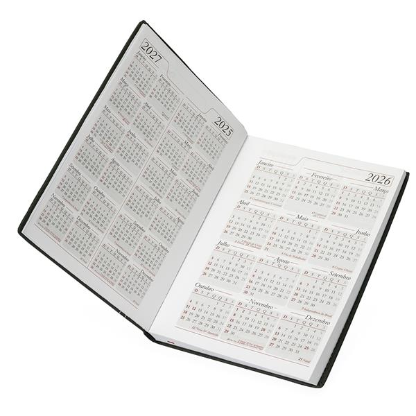 Agenda diária 2026 com capa em couro sintético e marca páginas em fita de cetim. Possui páginas dedicadas a dados pessoais, calendários de 2025 a 2027, lista de contatos, planejamento diário e mapas.