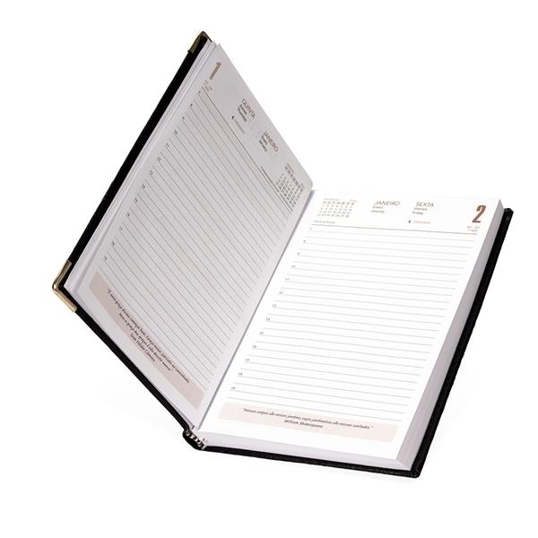 Agenda diária 2026 com capa em couro sintético e marca página em fita de cetim. Possui páginas dedicadas para dados pessoais, calendários de 2025 até 2027, orçamento pessoal, planejamento mensal, lista de contatos e mapas. Altura : 20,5 cm Largura : 14,5 cm Espessura : 2,5 cm Peso aproximado (g): 404