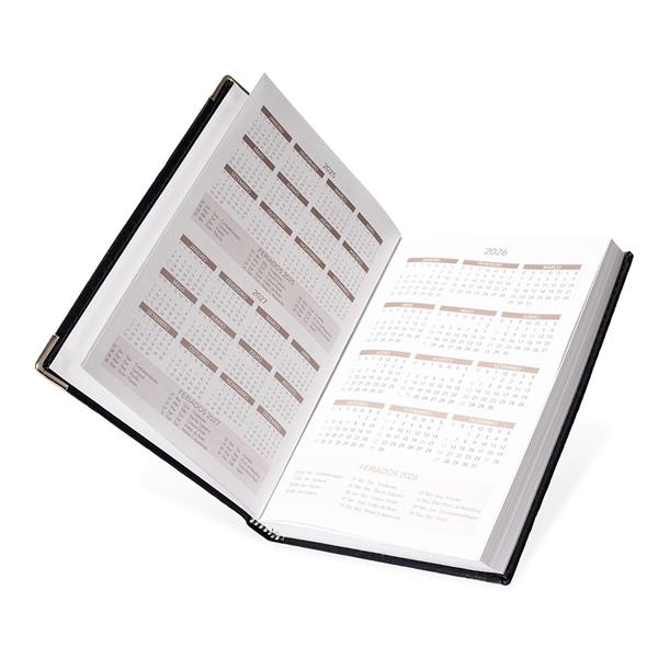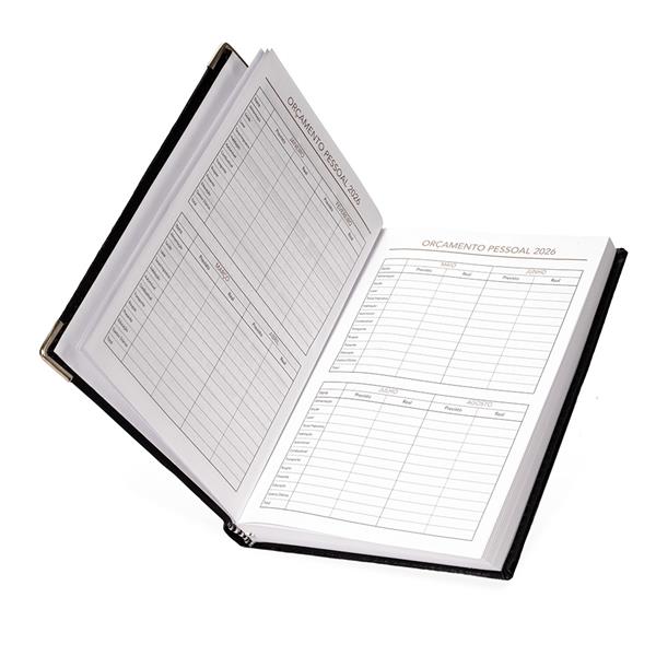 Agenda diária 2026 com capa em couro sintético e marca página em fita de cetim. Possui páginas dedicadas para dados pessoais, calendários de 2025 até 2027, orçamento pessoal, planejamento mensal, lista de contatos e mapas.