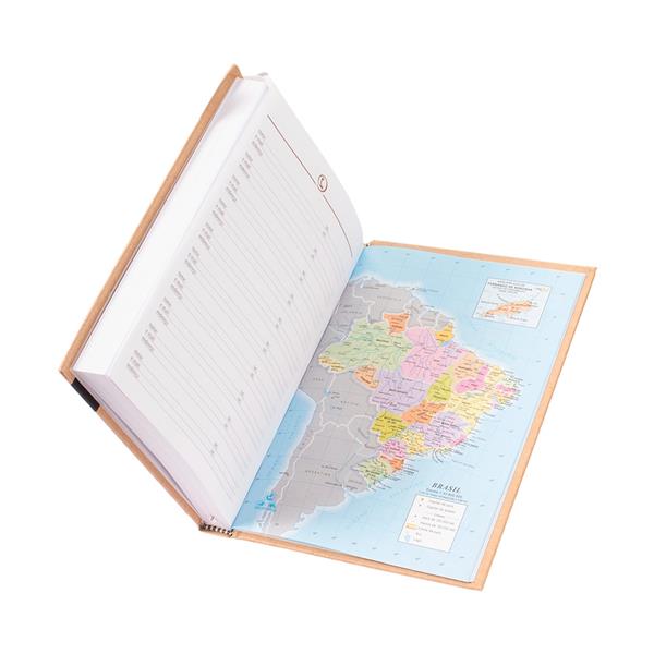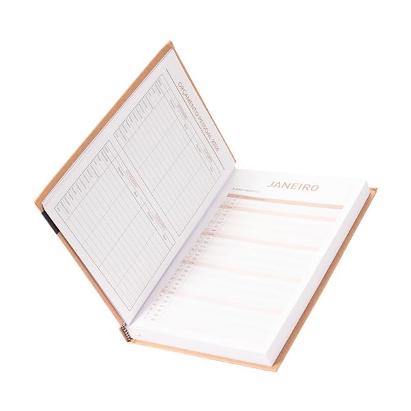 Agenda diária modelo 2026 de capa dura em kraft e marcador de páginas em fita de cetim. Apresenta páginas dedicadas à dados pessoais, calendários de 2025 até 2027, orçamentos pessoais, anotações, planejamento mensal, endereços de contato e mapas.