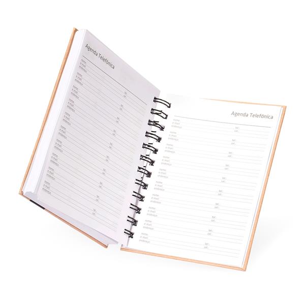 Agenda diária 2026 com capa dura em kraft e encadernação Wire-O. Contém páginas dedicadas a dados pessoais, calendários de 2025 a 2027, orçamento pessoal, planejamento mensal, anotações diárias, lista de contatos e aniversários do mês. Altura : 17 cm Largura : 13,5 cm Espessura : 2,5 cm Peso aproximado (g): 296